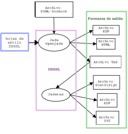 Un pequeño comentario respecto a los esquemas anteriores: Es posible procesar un archivo DocBook XML a través de las hojas de estilo DSSSL con openJade. Esto se debe, en un principio a que XML es un subconjunto de SGML.
