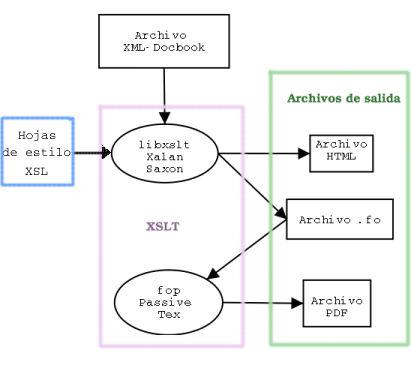 A continuación se muestran dos breves esquemas de los procesos por los que pasan los archivos fuentes DocBook SGML y XML, respectivamente, para llegar a formatos de salida como PDF, HTML, PostScript, etc.